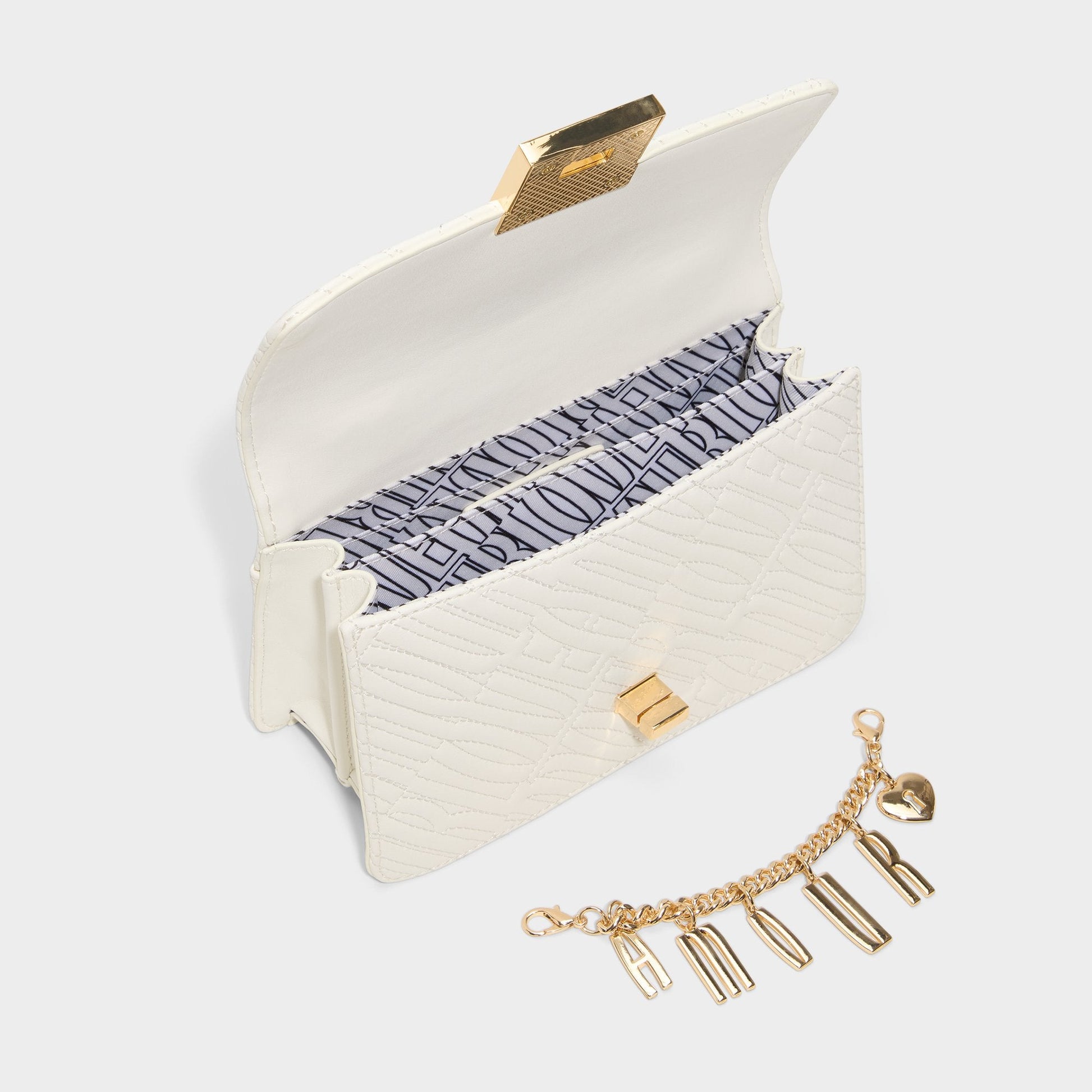 Mini but mighty, this quilted white body pairs with a sleek gold arc handle and a lettered AMOUR chain that adds jewelry vibes while guarding essentials, turning everyday moments into a touch of purse-sized luxe. Carry it with a slip dress for soirees or tuck it under a blazer for brunch dates to finish the look.