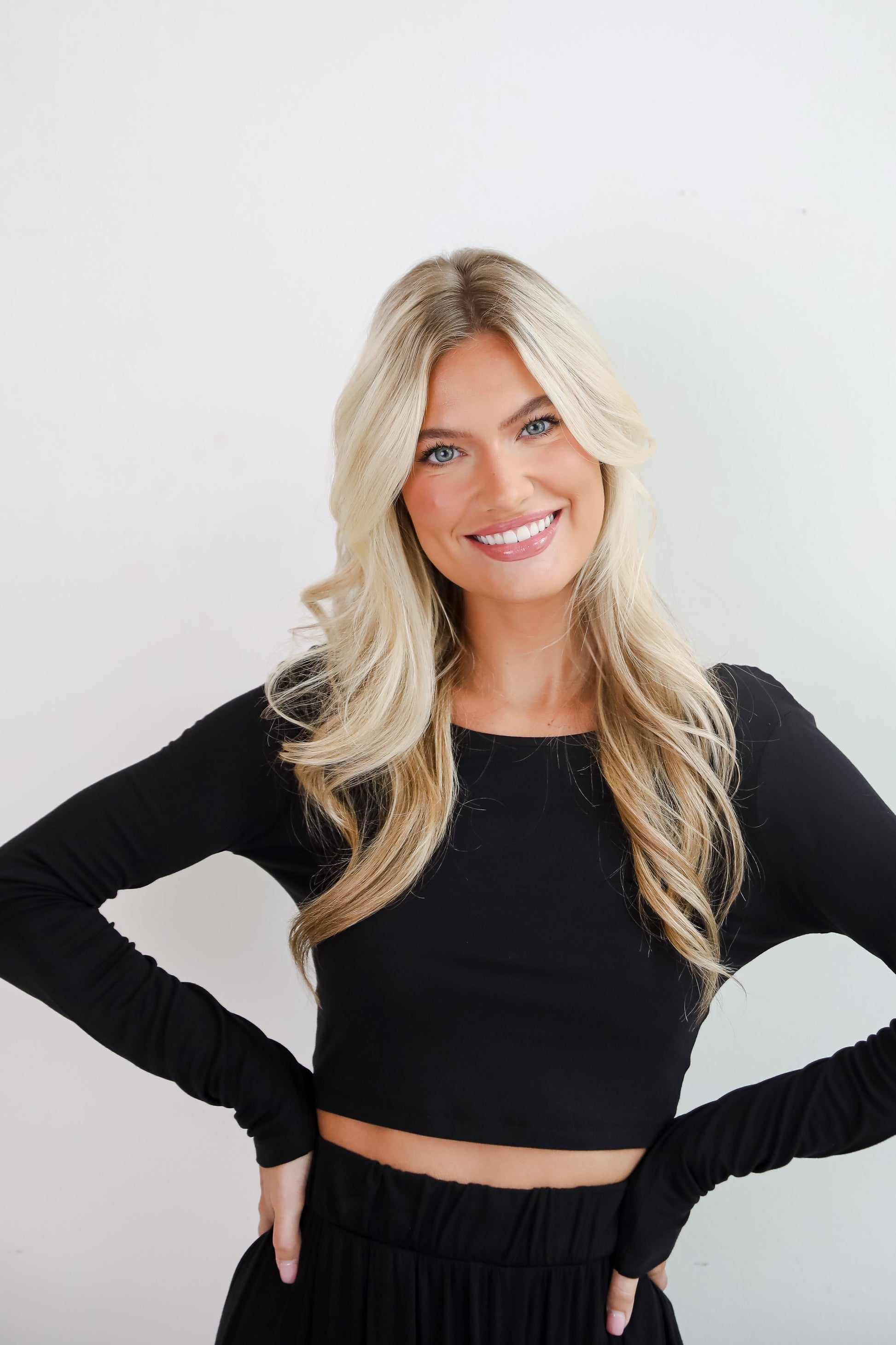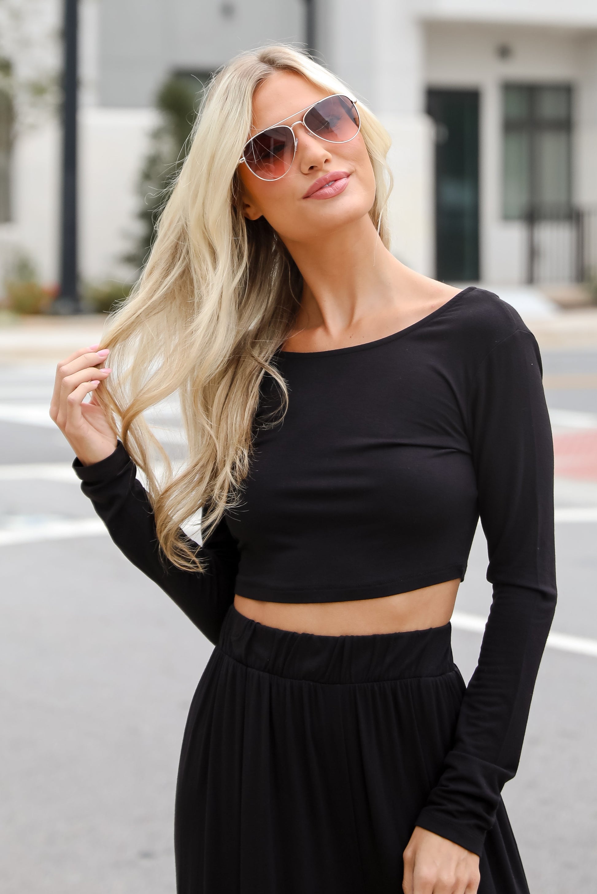 Dressing for special occasions is always simple when you have a luxe look like the Expert Charm Black Crop Top! Crafted from soft, stretchy jersey fabric, this top offers a comfortable, flattering fit that moves with you throughout the day. The classic long sleeves and cropped length create a modern silhouette that's perfect for layering or wearing on its own. The scoop back detail adds a chic, subtle twist, giving the top a touch of elegance and allowing you to showcase your favorite accessories or a hint of skin. Ideal for pairing with high-waisted jeans, skirts, or leggings, this versatile crop top is a must-have addition to your wardrobe, combining simplicity with contemporary style!
