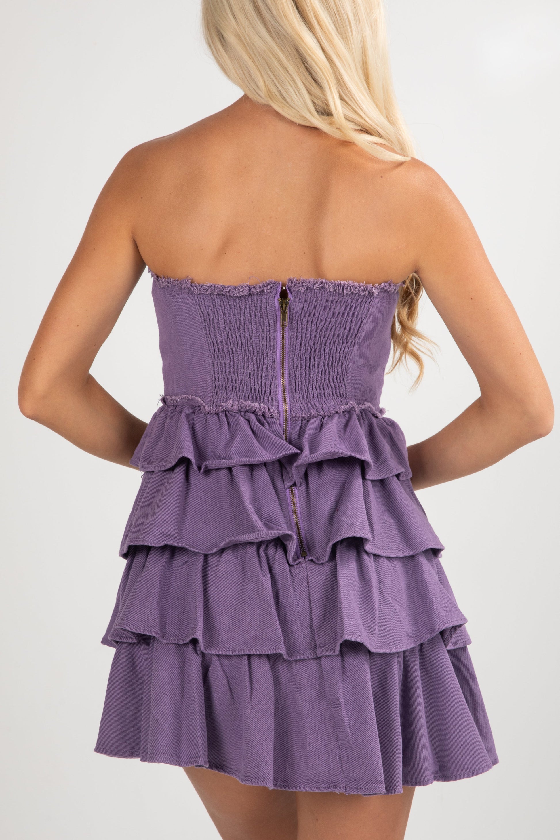 - Strapless Neckline with Frayed Hems