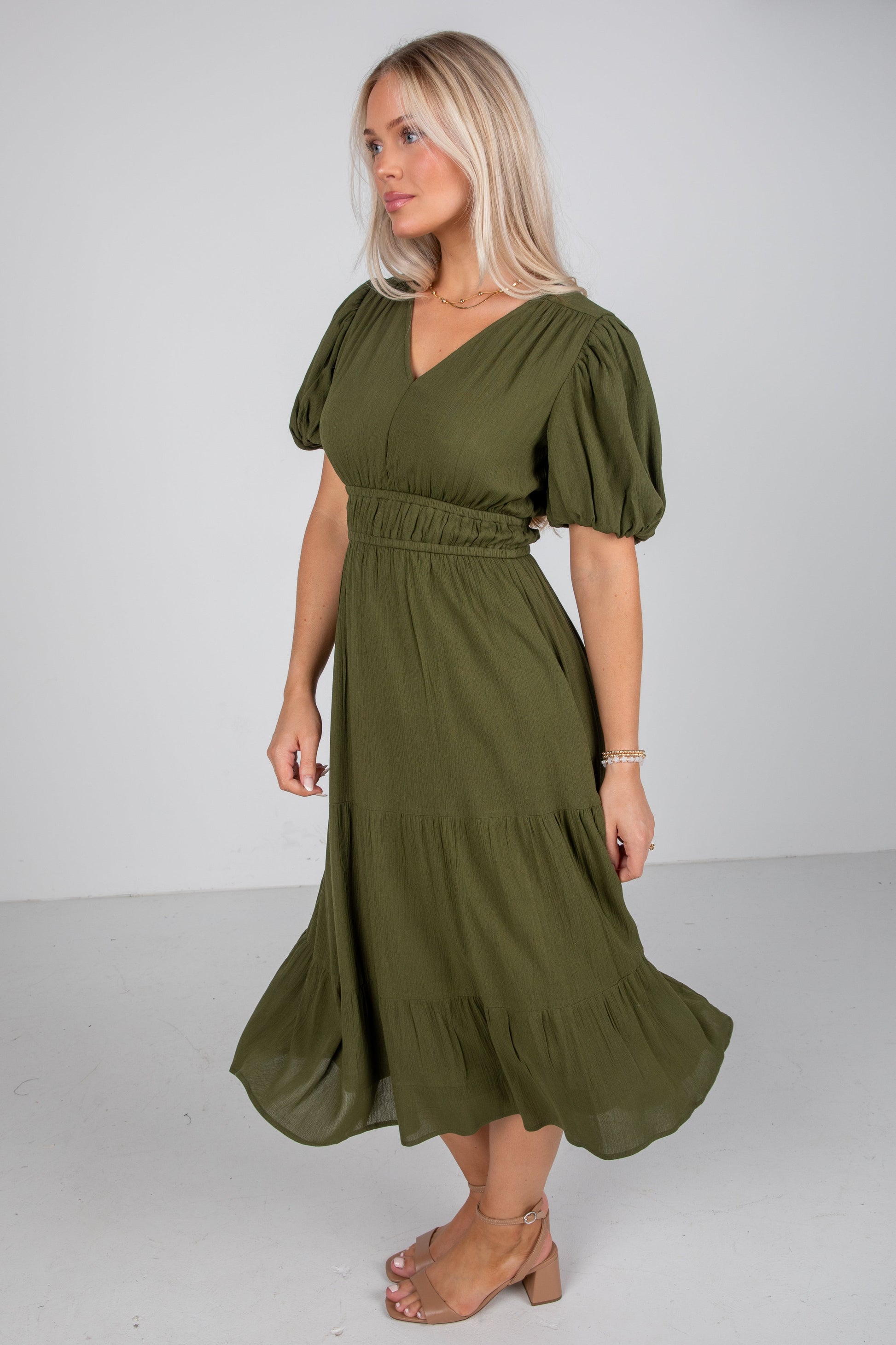 Embrace effortless style in the Have The Best Time Olive Midi Dress! Featuring romantic puff sleeves and a tiered, flowy silhouette, this dress moves gracefully with every step. The soft olive hue adds a timeless, versatile touch, while the maxi length creates a flattering, elongating look. Perfect for brunches, garden parties, or casual outings, pair it with sandals for a relaxed vibe or dress it up with heels and accessories for a polished, feminine ensemble!