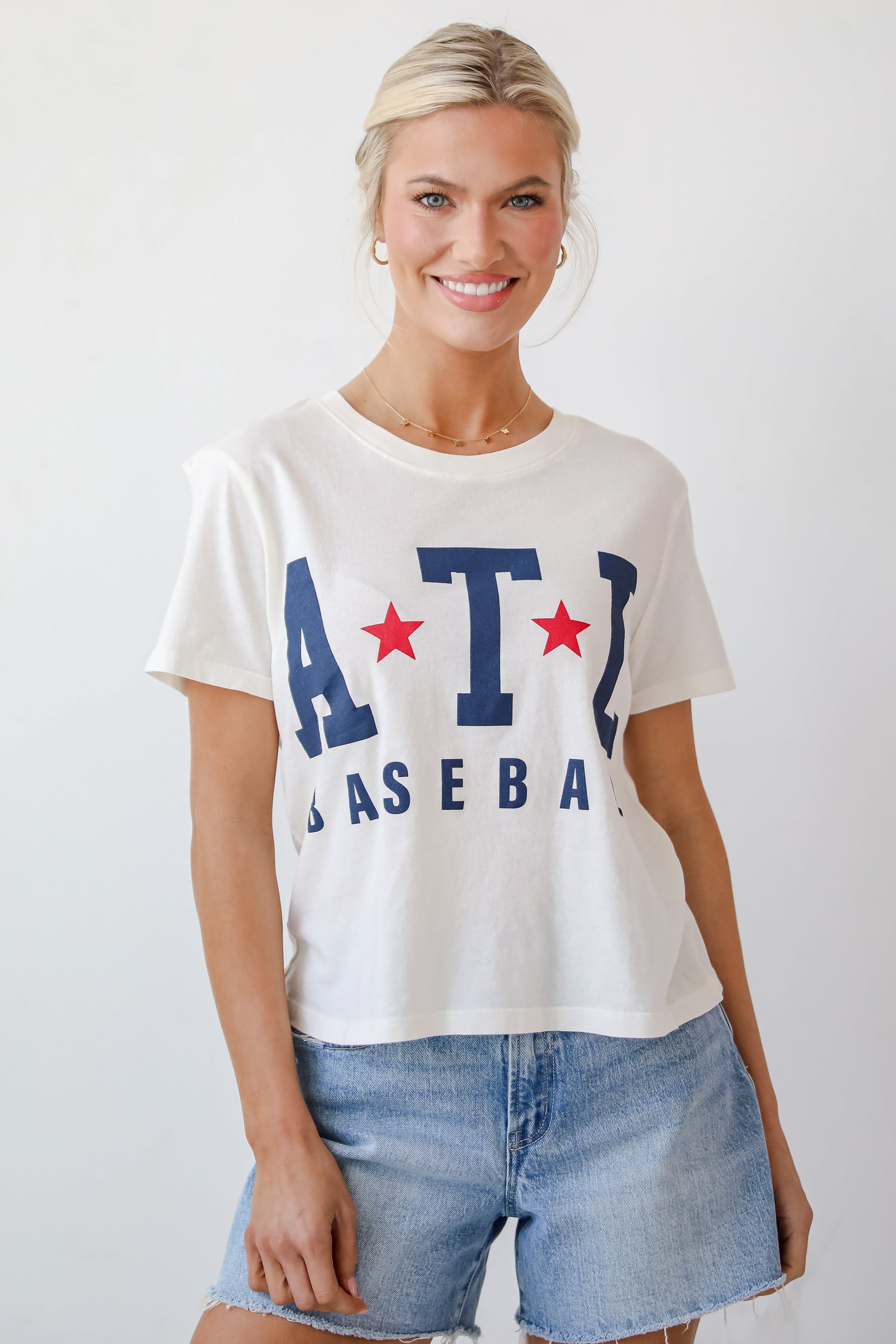 Calling all baseball fans, the Off White ATL Baseball Star Cropped Tee was made just for you! This comfy tee is designed with a soft and stretchy lightweight knit. It features a crew neckline, short sleeves, and a relaxed mid-crop fit with “ATL Baseball' on the front. Style the Off White ATL Baseball Star Cropped Tee with your favorite denim shorts and sneakers for a casual look!