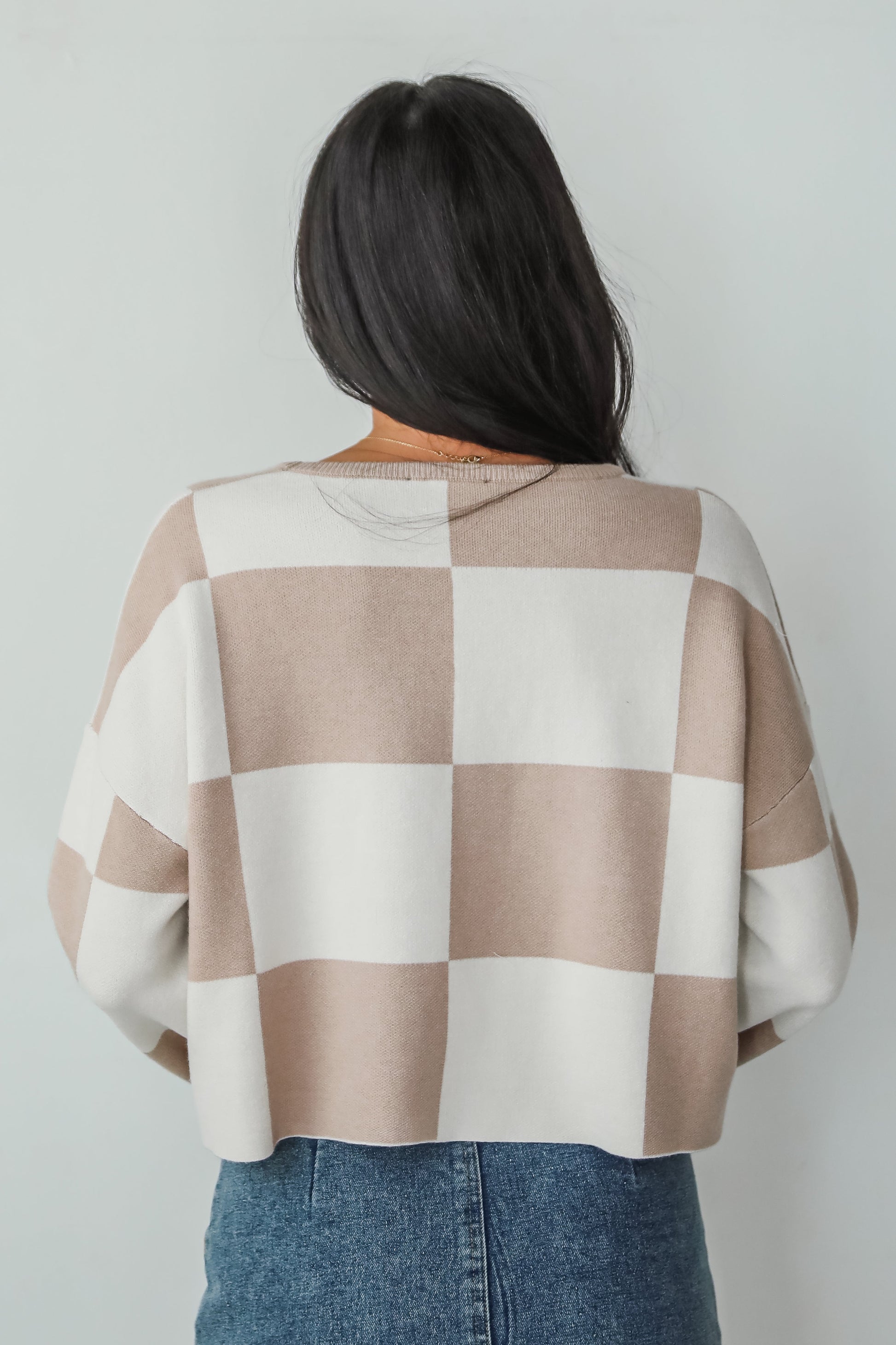 Let everyone see you're a cutie in the Perfect Classic Taupe Checkered Cropped Sweater! Featuring a bold checkered pattern in soft taupe and ivory, this sweater strikes the perfect balance between classic and contemporary. The cropped fit gives it a modern, flattering silhouette, making it perfect for pairing with high-waisted jeans, skirts, or leggings. Crafted from soft, comfortable fabric, it’s perfect for layering on cooler days or wearing solo for a chic, casual look. Whether you're dressing up or down, this versatile sweater is a must-have for effortless style!